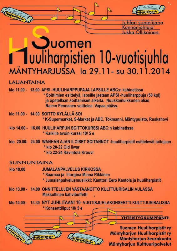 Kalenterilinkki 29. - 30.11.2014 SUOMENHUULIHARPISTEILLA 10 - VUOTISJUHLA MÄNTYHARJULLA Harpistien majoitus ja yhteiskuljetus Lankaniemen Leirikeskukseen TÄSSÄ 29.11.2014 klo 14 - 16 HUULIHARPPUKURSSIN KOULUTUSKAPPALEET, NUOTTEINA JA STEMMOINA. Ilmoittautuminen paikanpäällä ABC-kabinetti 10 € / 5 €. On hyvä jos ehdit tutustua kappaleisiin sekä ykkös että kakkosääneihin. Näin kurssin tuloksena saadaan hienoja saundeja valmiiksi yhteissoitossa. Liitteet