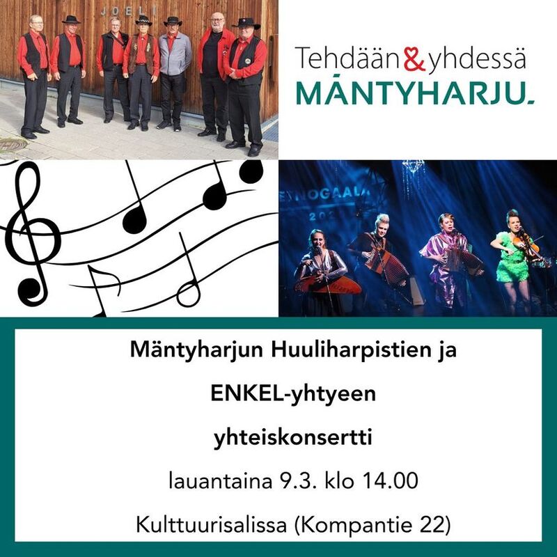 Mäntyharjun Kulttuurisali Kompantie 22 täyttyy pelimannimusiikista! Konsertti kulttuurisalissa la 9.3. klo 14.00 alkaen. Konserttiin on vapaa pääsy. Mäntyharjun Huuliharpistien ja ENKEL-yhtyeen yhteistyö käynnistyi viime kesänä Helsingissä, Oodissa järjestetyssä Aineettoman kulttuurin valtakunnallisessa pääjuhlassa. Samaisessa juhlassa pelimannityylinen huuliharpunsoitto julistettiin virallisesti kansalliseksi eläväksi perinnöksi ja Huuliharpistit saivat kunnian esiintyä tilaisuudessa. Mäntyharjun Huuliharpistit on esiintynyt eri kokoonpanoissa ja soolosoittajina vuodesta 2003 alkaen yhteensä lähes 700 kertaa. Nykyään yhtyeessä on kahdeksan jäsentä, 4 ykkös- ja kakkosäänen soittajaa, 2 sointuharpun soittajaa ja 2 bassoharpun soittajaa. Vuonna 2008 yhtye palkittiin Mäntyharjun kunnan Kulttuuri-palkinnolla ja stipendillä. Yhtye on esiintynyt Kaustisen Kansanmusiikkifestivaaleilla vuodesta 2009 alkaen kuusi kertaa. Vuodesta 2004 alkaen Mäntyharjun Huuliharpistit on voittanut eri kokoonpanoilla ja soolosarjoissa yhteensä 106 pokaalia. ENKEL on herkkä ja hersyvä pelimanniyhtye, jonka ohjelmisto koostuu hittikappaleista aina 1800-luvulta 2020-luvulle asti. ENKELin neljä persoonallista muusikkoa luottavat perinteeseen, luovuuden voimaan ja toisiinsa – ENKELissä jokainen on supersankari omalla laillaan. ENKEL-yhtyeen kokoonpano Leija Lautamaja (3-rivinen haitari, laulu), Miia Palomäki (2,5-rivinen haitari, laulu), Maija Pokela (kantele, laulu) ja Iida Savolainen (alttoviulu, laulu) Yhtye käyttää ennakkoluulottomasti hyväkseen epätavallisen instrumentaationsa moninaisia mahdollisuuksia ja viimeistelee sointinsa milloin kauniisti yhteen soivalla ja milloin tarkoituksenmukaisesti dissonoivalla laulullaan. Kappaleiden aiheet vaihtelevat heinälatoromantiikasta sanattomiin ja sanallisiin rakkauslauluihin sekä riipivästä ikävästä hikiseen hiihtokilpaan. ENKEL on esiintynyt Mäntyharjussa viime kerralla vuonna 2021, joten pitkästä aikaa mahdollisuus päästä nauttimaan heidän soittoaan Kulttuurisalissa. Tämä yhteistyö jatkuu myös vuoden 2024 Kaustisen kansanmusiikkifestivaaleilla (Kaustinen Folk Music Festival) (ENKEL) Maarit Kytöharju |